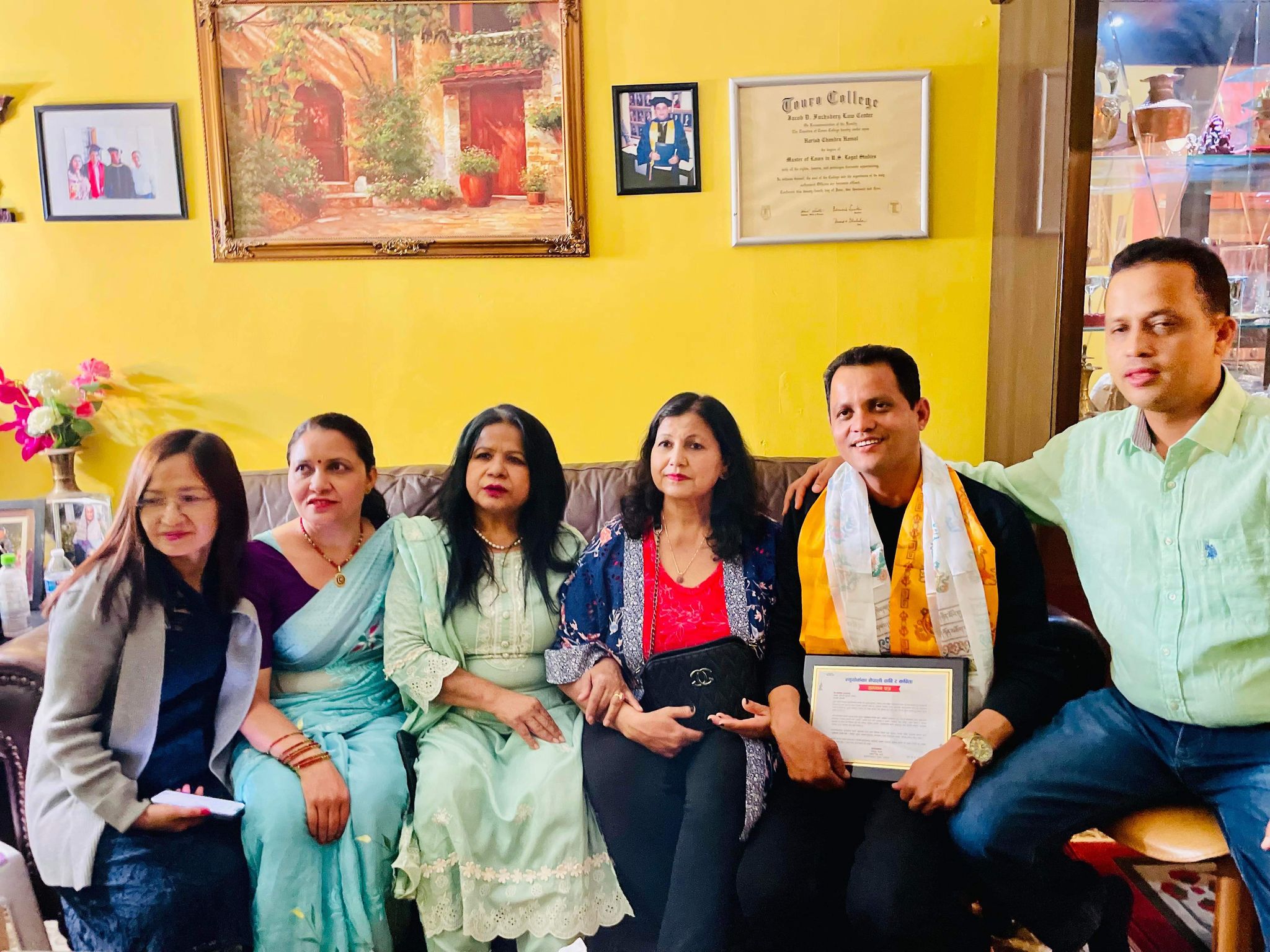 १३ जेठ, न्युयोर्कः हाल आफ्नो निजि भ्रमणमा रहेका चौलानी पुस्तक भण्डारका अध्यक्ष श्री मानसिह साउद न्युयोर्कमा सम्मानित हुनु भयो । सन् २०१८ मा न्युयोर्कका नेपाली कवि र कविता पुस्तक प्रकासन गरेर प्रवासमा बस्ने जो कोहि नेपालीलाई लेखनमा हौसला दिइरहने चौलानी पुस्तक भण्डारका अध्यक्ष एक समारोहका बिच पुस्तकमा समावेस भएका कविहरू अनेसास न्युयोर्क च्याप्टरका महासचिव, कवि जानुका वस्ती ढकाल, गीतकार तथा कवि पद्मालिखा मगर, कवि गीता पंथ पराजुली र उक्त पुस्तकका सम्पादकद्वय मध्येका एक किशनसिंह धामीले संयुक्त रूपमा खादा ओढाएर सम्मान पत्र टक्या्रउनु भएको थियो ।